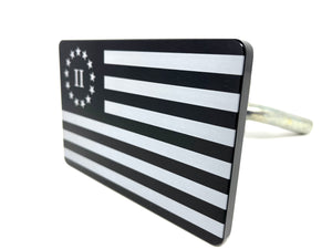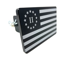 Laser engraved black anodized aluminum. Our trailer hitch covers are made from ⅜” thick 6061 aircraft grade aluminum with a military grade anodizing. The receiver is powder coated steel and come with a zinc plated pin and clip.
