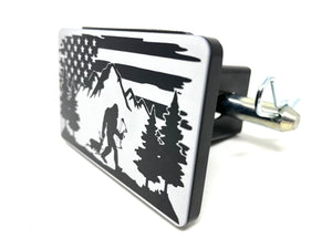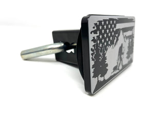 Laser engraved black anodized aluminum. Our trailer hitch covers are made from ⅜” thick 6061 aircraft grade aluminum with a military grade anodizing. The receiver is powder coated steel and come with a zinc plated pin and clip.